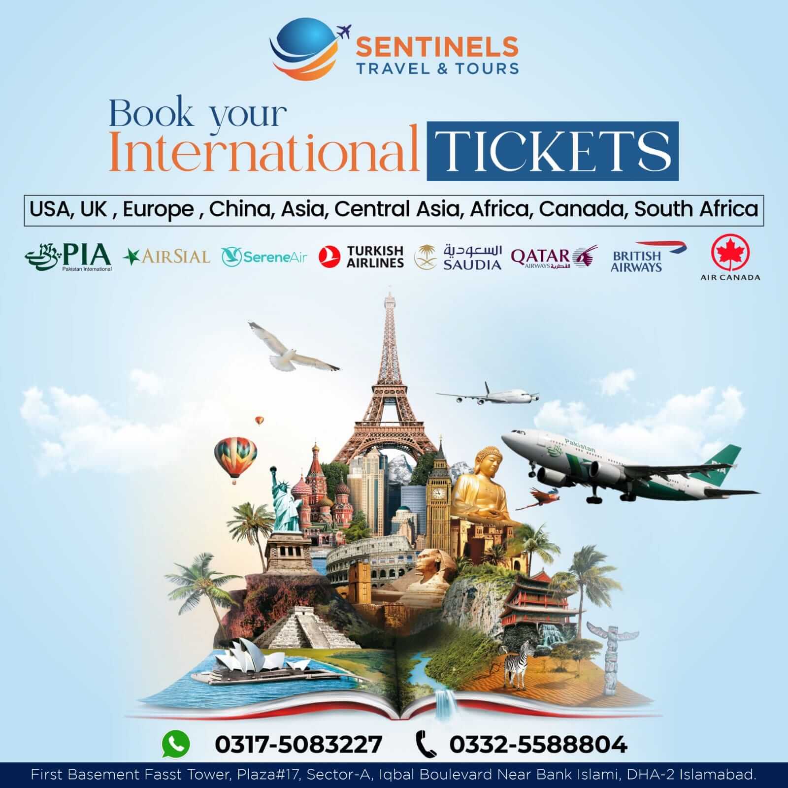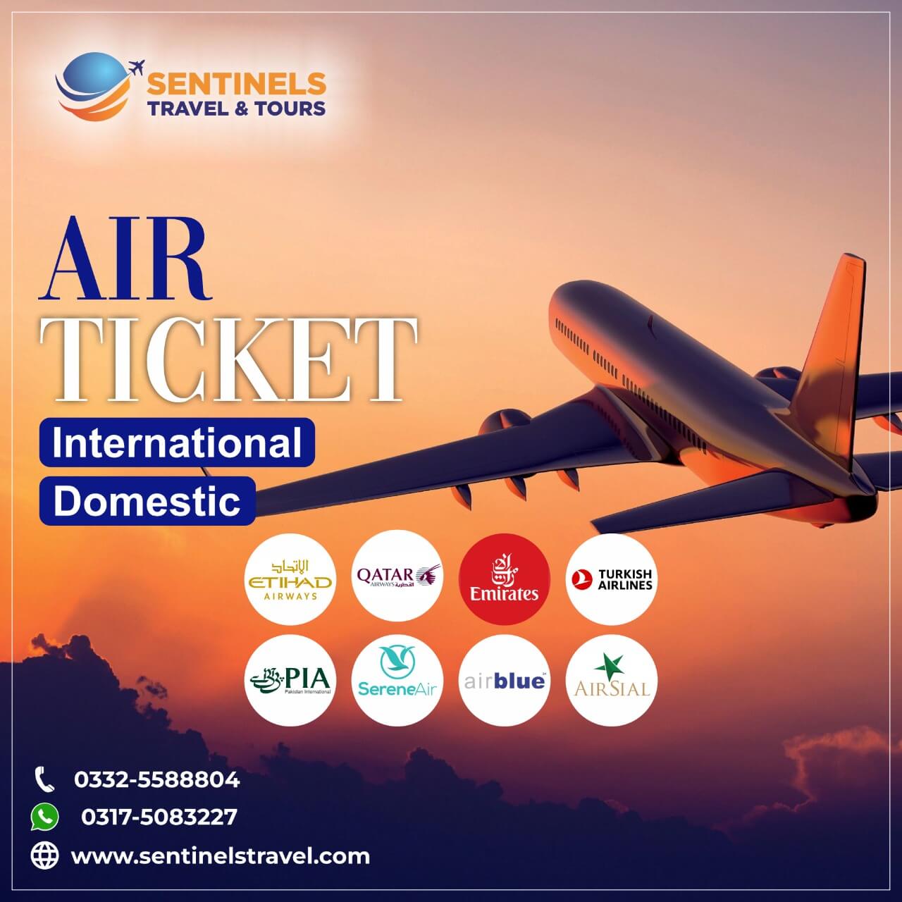 Sentinels Travel & Tours provides seamless international ticketing services for all major airlines worldwide, ensuring you reach your destination with ease and comfort.